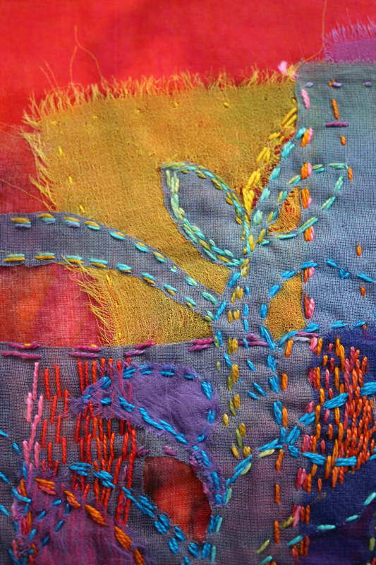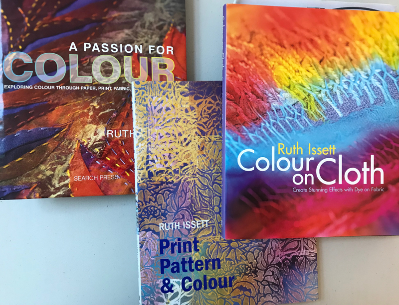 It’s been very cold these last few days although bright and sunny overhead. After a bracing walk along the beach at St Andrews – think opening sequence of Chariots of Fire, without the running of course – I thought it was time for another Studio Conversation. I was very excited to have the chance to talk with Ruth Issett at a recent Textile Study Group weekend. Ruth is a member of Prism and Textile Study Group and has exhibited widely with both groups. She is very well known through her teaching, books and has an international reputation as a textile artist. I first met Ruth at a Scottish Embroiderers’ Guild Summer School but she taught the City & Guilds textile courses for many years and can often be found on the Art van Go ‘Artist in Action’ stand at the annual Knitting & Stitching shows so she has huge teaching experience. Over the years I have acquired several of her books and one title in particular seems to sum up Ruth’s work – A Passion for Colour. It was this passion that I wanted to hear about and so I started by saying to Ruth – everyone knows you for the vibrant use of colour, has this always been a feature of your work?